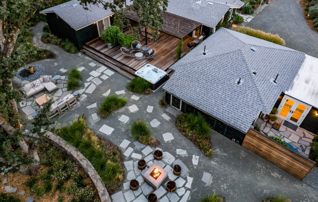 At first glance, this place doesn’t shout “wine country showpiece.” It’s a modest little ranch house tucked at the end of a cul-de-sac. But step inside — and then outside — and the transformation is jaw-dropping. Interiors are intentional, artful, and beautifully designed, but it’s the grounds that steal the show: sprawling gardens, fire pits, patios, even a bridge over a creek leading to tucked-away gathering spaces. It’s a home that surprises at every turn and reminds you that wine country living is as much about what’s outside as in.